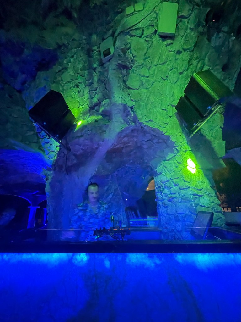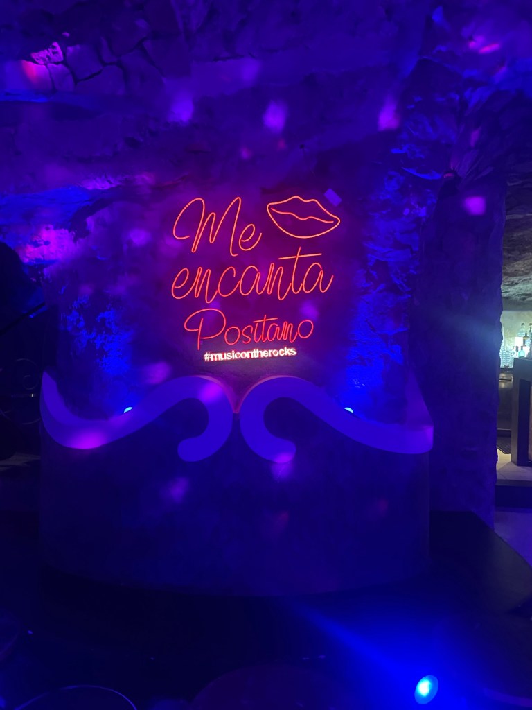 While waiting, we grabbed drinks upstairs at a bar with a DJ and great energy. Once it was time, we headed down to Music on the Rocks — which is exactly what it sounds like: